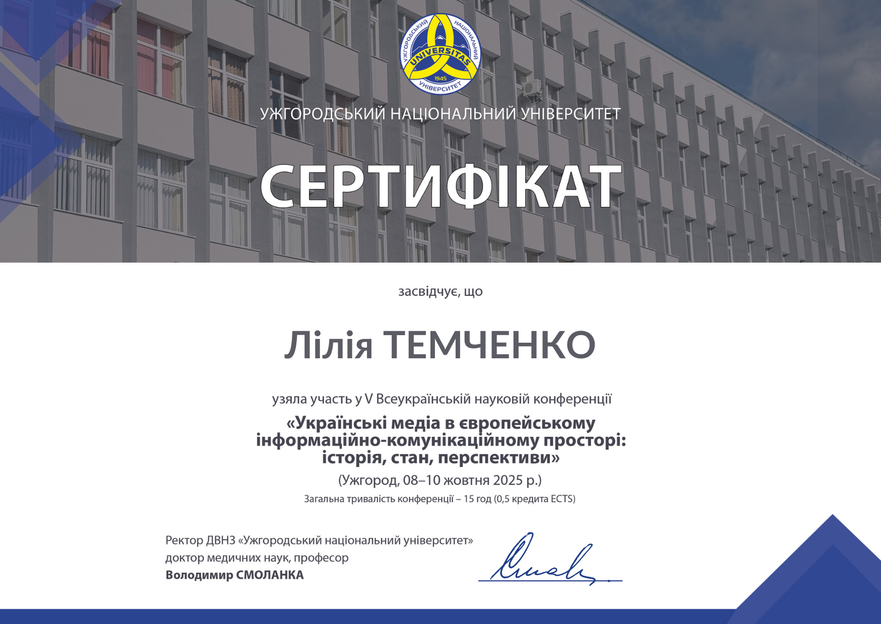 ІV Міжнародна наукова конференція «Українські медіа в європейському інформаційно-комунікаційному просторі: історія, стан, перспективи», сертифікат, Ужгород: Ужгородський національний університет, 08-10.10.2025,0,5 кредита;